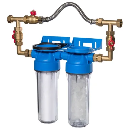 Le filtre double est composée de 2 parties livrées prêt à l’emploi avec un kit de raccordement complet. Il se compose d’une clé, d’une équerre et d’un by-pass en cuivre. Le débit maximum est de 1500 litres par heure. Entrée et sortie : 3/4 »