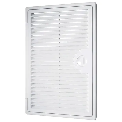Porte de ventilation à volet avec serrure en plastique et en plastique ABS. Vissées, elles sont idéales pour les plaques de plâtre. La nouvelle porte a une serrure pratique qui peut être montée dans des plafonds suspendus.